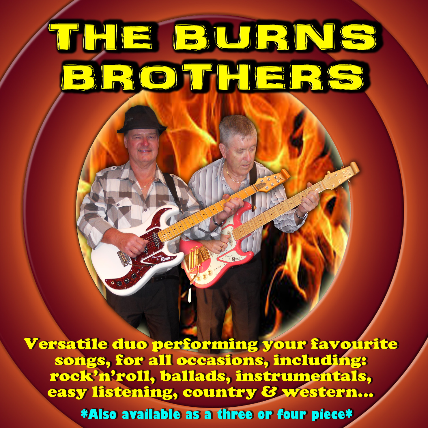 Note: Although the ‘Burns Brothers’ are a duo, they can also play as a trio if required, by including another vocalist, guitarist or keyboard player.